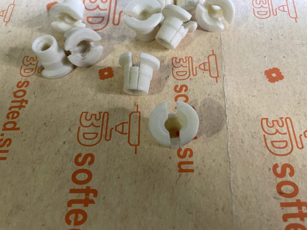 3Д печать клипс в фары для карьерного самосвала Volvo A40G по 3Д модели клиента. По просьбе заказчика был выбран материал PA6 GF30 от MAKO. Ссылка на обзор данного пластика тут. При изготовлении использовались поддержки. Всего сделали 10 клипс по 5 штук расположены разными торцами к столу для вариативного использования конечного пользователя.